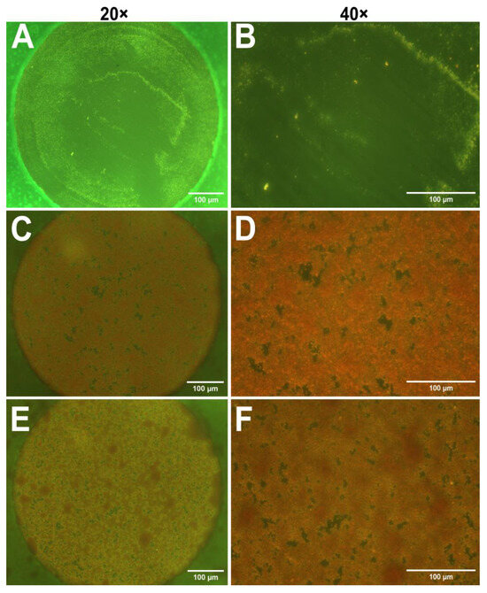 Optical micrographs of gold electrodes stained with safranin to visualize biofilm formation. (A,B) TSB control electrodes at 20× (A) and 40× (B) magnifications. (C,D) Electrodes incubated with S. aureus, magnification 20× (C) and 40× (D). (E,F) Electrodes incubated with S. epidermidis, magnifications 20× (E) and 40× (F). Scale bars: 100 µm.