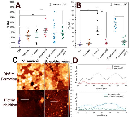 To assess biofilm inhibition, both Rs and Rct values were compared, as shown in Figure 4A. TSB control exhibited a statistically significant difference compared to TSB with AMO, S. epidermidis in AMO and TSB, and S. aureus in AMO and TSB. This may suggest that the presence of AMO in the medium for 24 h can slightly influence the solution resistance. On the other hand, biofilm formation itself did not result in a notable difference in Rs values.