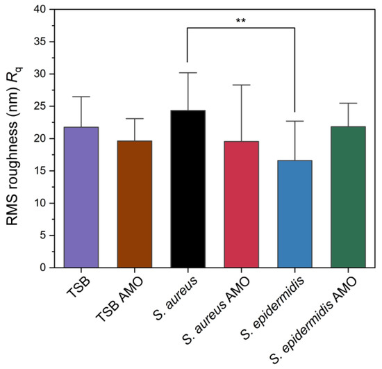 The root-mean-squared (RMS) roughness (Rq) values obtained from AFM analysis are presented in Figure 5. While S. aureus exhibited ~24 nm, S. epidermidis biofilm showed ~16 nm, and this difference was statistically significant. Chatterjee et al. reported that RMS roughness values significantly increased upon biofilm formation, with 2-day-old S. aureus biofilm reaching 155 nm compared to 11 nm for the polycarbonate substrate control [45]. Their study suggests roughness is increased over time by biofilm formation. In our study S. aureus has the highest value but control itself is also a rough surface. Also, results suggest that S. epidermidis has the lowest roughness parameter that might be related to its compact biofilm.