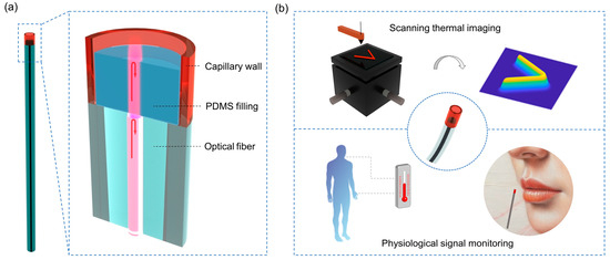 Self-adaptive polymer Fabry–Pérot interferometer (PFPI) and its thermal sensing applications: (a) Schematic diagram of the PFPI structure. The PFPI is composed of a single-mode optical fiber spliced with a glass microcapillary, and the hollow core region is filled with polydimethylsiloxane (PDMS). The light reflections at the interface of silica-PDMS and PDMS-air form a Fabry–Pérot interferometer (FPI). (b) Thermal sensing applications of the PFPI include scanning thermal imaging and human physiological signal monitoring.