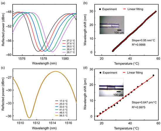 Characterization of the temperature sensing performance of different FPI sensors: (a) Monitoring the spectral shift in the PFPI sensor at different temperatures. (b) The linear resonant wavelength shift in PFPI related to temperature. The inset is a microscopic image of a PFPI sensor. (c) Monitoring the spectral shift in the air-filled Fabry–Pérot interferometer (AFPI) sensor at different temperatures. (d) The linear resonant wavelength shift in the AFPI sensor related to temperature. The inset is a microscopic image of an AFPI sensor.