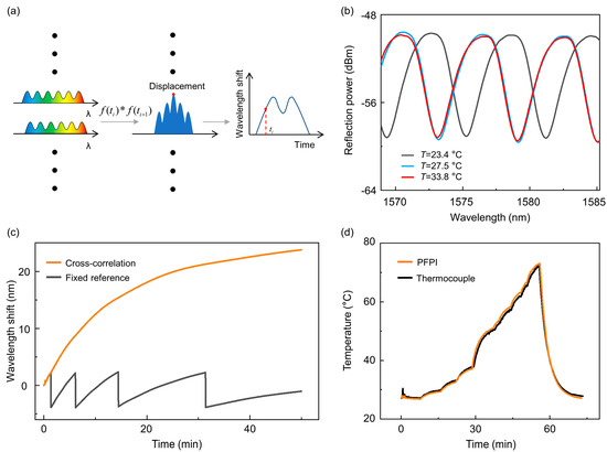 Cross-correlation algorithm for wide spectral shift tracking: (a) The schematic of the cross-correlation algorithm for spectral shift tracking. “✱” denotes the cross-correlation operation of the two. (b) Typical spectra of the PFPI sensor at different external temperatures. (c) Monitoring the wavelength shift over a large dynamic range using the fixed reference method and the cross-correlation algorithm, respectively. The fixed reference method makes incorrect judgments when the wavelength shift spans free spectral range, while the cross-correlation algorithm can achieve stable wavelength tracking results. (d) Typical results of monitoring temperature change in a ceramic heating plate using a PFPI sensor and thermocouple.
