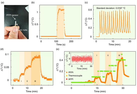 Figure 4b shows the dynamic response of the PFPI sensor, demonstrating its ability to respond rapidly to temperature changes. The response time from the beginning of temperature change to stability is approximately 14 s. The response time can be further improved by optimizing the heat capacity of the supporting ceramic tube. Repeatability of sensor response after performing a rapid 16-repeatability test, the standard deviation was only 0.0167 °C, and the consistent results of the sensor were confirmed, as shown in Figure 4c. To assess the temperature resolution of the PFPI sensor, electric currents of 0.3 A, 0.35 A, and 0.4 A were sequentially applied. The corresponding measurements clearly exhibit a stepwise response with a high signal-to-noise ratio, resolving temperature changes as small as 0.025 °C (Figure 4d). Notably, given the sampling interval (5 pm) of the optical interrogator, the ultimate resolution of the PFPI sensor is ~5.3 × 10−3 °C. A comparative analysis of PFPI, AFPI, and commercial thermocouple sensors is presented in Figure 4e. The PFPI sensor consistently exhibits stable performance and promptly returns to its initial state following each cessation of current input. In contrast, the thermocouple sensor, with a detection limit of 0.1 °C, displays lower accuracy and delayed temporal response. For the AFPI sensor, due to its very low temperature sensitivity of 0.647 pm/°C, the wavelength shift under a temperature change of 0.4 °C remains below the 5 pm sampling interval of the interrogator. As a result, the temperature signal becomes indistinguishable from system noise. Notably, limited by the response time of PFPI sensors, pure-silica fiber-optic sensors (Figure 2d) are more appropriate for scenarios involving rapid temperature fluctuations. Nevertheless, we contend that the proposed PFPI sensor remains well-suited for highly sensitive temperature measurements in most everyday environments.