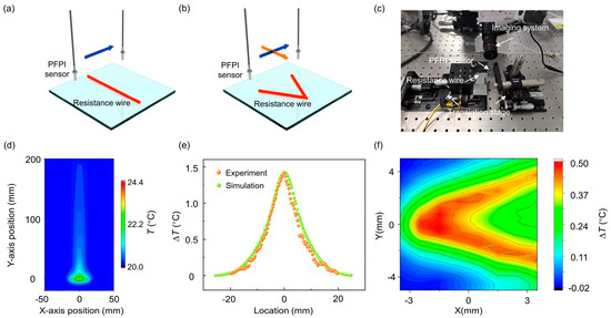 A thermal field reconstruction experiment was subsequently carried out. Figure 5a,b show the schematic diagrams of the heat sources used to generate one-dimensional (1D) and two-dimensional (2D) thermal fields, respectively. The heat sources are constructed using electrified resistance wires. By scanning the PFPI sensor in a single direction above the wire using a translation stage, the 1D temperature distribution is obtained. In the 2D case, a V-shaped resistance wire was used to construct a spatially varying thermal field. The sensor was swept along two orthogonal directions to map the temperature distribution of the corresponding plane. The experimental setup is depicted in Figure 5c. The PFPI sensor, enclosed in a ceramic tube, was mounted on an optical translation stage, serving as the sensing probe. The resistance wire was fixed on another translation stage, functioning as the thermal field generator. The current through the resistive wire is controlled by using a DC power supply, so that the temperature of the resistance wire gradually rises to a steady state. A microscopic imaging system was positioned laterally to monitor the relative position between the PFPI sensor and wire, facilitating precise distance adjustments. The entire setup was enclosed in a custom acrylic cover to minimize temperature interference from ambient airflow.
