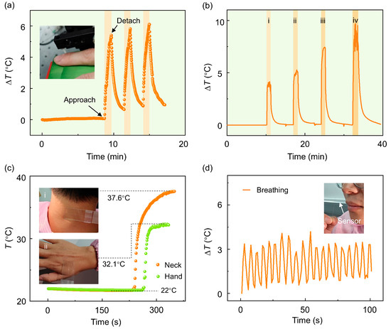 We subsequently explore the use of the PFPI sensor for non-contact temperature sensing, human body temperature monitoring, and respiratory signal detection. Figure 6a presents the results of non-contact finger temperature sensing using the PFPI sensor. The optical interrogator is configured to record data at a rate of 1 Hz. Prior to 520 s, the system remained in a stationary state, during which a slight increase in ambient temperature was observed. After that, a finger was moved into the detection area. The relative height between the sensor and the base of the detection area was pre-calibrated to maintain a fixed sensor-to-finger distance of approximately 3 mm. A steadily rising sensing signal was recorded during the presence of the finger. After 60 s, the finger was withdrawn, resulting in a continuous decrease in the detected temperature signal. This process was repeated three times, and similar waveforms were obtained across all trials, demonstrating the reproducibility and potential of the PFPI sensor for non-contact human temperature monitoring. Figure 6b shows the results of the sensor detection signals at different distances. For regions i–iii, the finger is at distances of 13 mm, 8 mm, and 3 mm from the sensor, respectively. In particular, region iv shows the sensing result when the finger directly contacts the sensor. At this time, the sensor signal fluctuates greatly, which may be related to the shaking of the finger.