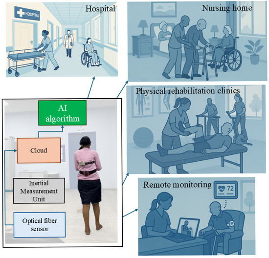 Taking into account this background, intelligent textiles and optical fiber biosensors are being integrated into conventional wearable devices for real-time monitoring of movement and physiological parameters. When combined with AI and cloud computing, these technologies support accurate, secure, and intelligent healthcare solutions [33,34,35]. The use of AI algorithms can provide a new tool for early fall risk detection outside clinical environments with the possibility of remote health monitoring, where the protocols of physical rehabilitation can be automated and are no longer restricted only to manual measurements, which can provide optimization of the treatments [20]. For these reasons, this paper presents the development of an optoelectronic wearable sensor system for portable monitoring of the movement and physiological parameters of patients. The proposed approach uses AI algorithms for clustering, classification, and regression of the data, which provide important tools for the clinicians and can be used not only in clinical environments but also in remote health monitoring conditions. Figure 1 presents a summary of the proposed solution with not only the proposed application in TUG, but also the potential applications in home monitoring, physical rehabilitation clinics, hospitals, and nursing homes.