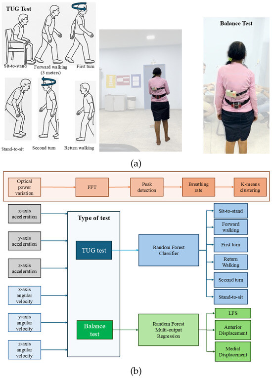 The TUG test was designed to evaluate mobility, balance, and fall risk in older adults. It involves measuring the time taken for a patient to walk a distance of three meters. In this study, a volunteer performed the TUG test in three variations: the TUG test alone (so-called conventional TUG), the TUG test combined with a cognitive task (recalling the number prior to the one mentioned by the evaluator while walking), and the TUG test combined with a motor task (juggling a ball while walking). For both validation tests, i.e., TUG and balance tests, the breathing rate estimation unit is placed on the chest of the patient, whereas the low-cost IMU is placed on the lower part of the lumbar spine (L4, L5 position) and secured to the patient using an elastic strap, as shown in Figure 3a.
