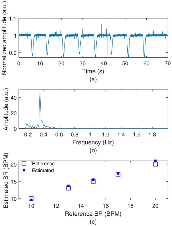 The characterization results for the breathing rate (BR) sensor system are presented in Figure 4, where it is possible to observe the results in time- and frequency-domains in Figure 4a,b, respectively. The time-domain results show a periodic signal with similar amplitude (mean amplitude variation of 0.9 a.u.), whereas Figure 4b shows the FFT of the signal in which there is a peak frequency at 0.34 Hz (resulting in around 20 BPM), which is the frequency used for the sensor characterization. Then, the results in Figure 4c demonstrate the estimated and reference frequencies applied on the optical fiber breathing sensor, where it is possible to verify the high accuracy of the proposed sensor, where a root mean squared error of 0.6 BPM is obtained.