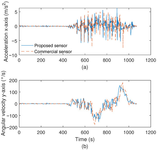 (a) Comparison between the proposed and commercial IMUs for the accelerometer on the x-axis. (b) Comparison between the proposed and commercial IMUs for the angular velocity on the y-axis.