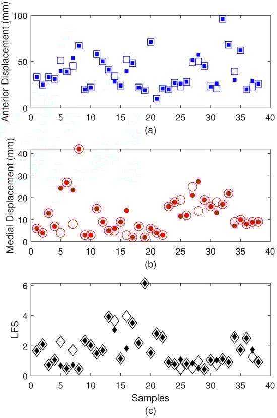 Estimated and reference values for the balance testing after the AI algorithm’s application for (a) open squares: reference anterior displacement; filled squares: estimated anterior displacement, (b) open circles: reference medial displacement; filled circles: estimated medial displacement, and (c) open diamond: reference LFS; filled diamond: estimated LFS.