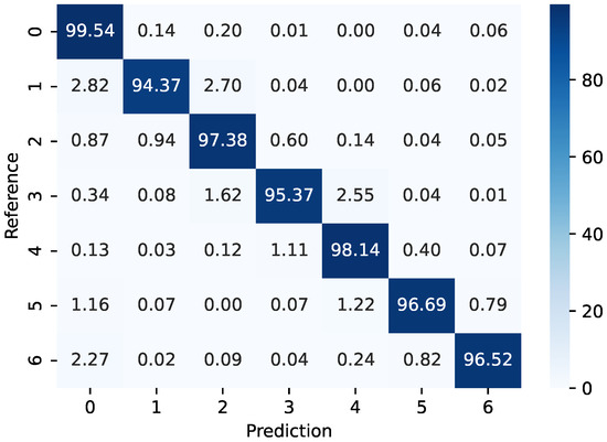 For the TUG protocol, the multi-output Random Forest classifier uses the angular velocities and accelerations and x-, y-, and z-axes as the inputs. However, the outputs in this case are the time for sit-to-stand, time for walking forward, turn time for return walking, and time to sit down. For each interval, the maximum acceleration is analyzed. In addition, the total time of the test is obtained from the sum of each interval, where the classification of the fall risk is made according the total time for the test, since this is the conventional method for such a classification. For the classification analysis, Figure 7 shows the confusion matrix of the reference and estimated times for the TUG tests, where accuracy above 95% is obtained for each class. In addition, the classes are numbered from 0 to 6, where each class is obtained considering each phase of the TUG test. In this case, class 0 refers to the start of the test, whereas classes 1 and 2 refer to the stand-to-sit and walking forward phases, respectively. Then, the first turn is considered as class 3 and walking back to the chair is considered class 4. Thereafter, there is a second turn when the patient reaches the chair, which is considered class 5. Finally, class 6 refers to the stand-to-sit condition in which the test is finished.