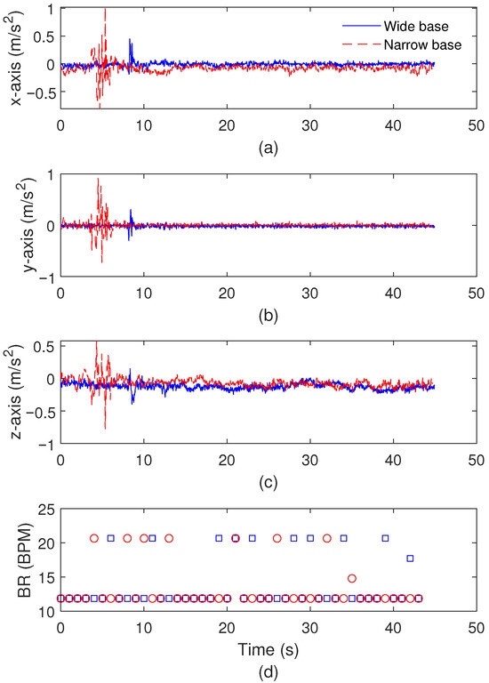 Acceleration variation of (a) x-axis, (b) y-axis, and (c) z-axis. (d) Breathing rate variation throughout the test.