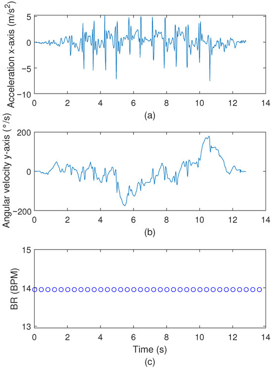 (a) IMU accelerometer response for the x-axis of the conventional TUG test. (b) IMU angular velocity response for the y-axis of the conventional TUG test. (c) Measured breathing rates during the conventional TUG test, blue circle: estimated BPM.
