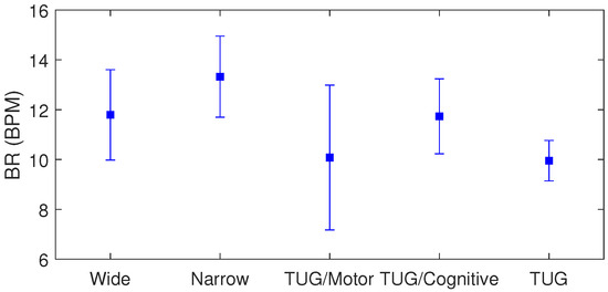 The statistical analysis of the data provides insights of the influence of each protocol on the biomechanical and physiological parameters as well as demonstrates the suitability of the proposed low-cost sensor system approach. The results of the breathing rates for all tests are presented in Figure 12. The results represent the results of all patients throughout the test. In this case, it is possible to verify the highest variation in the breathing rate for the TUG combined with the motor task. The mean values of the breathing rate are around 12.0 BPM, whereas the deviations of 1.6 BPM, 0.6 BPM, and 2.9 BPM were found for the balance tests with wide and narrow basse, conventional TUG, and TUG combined with motor tasks.