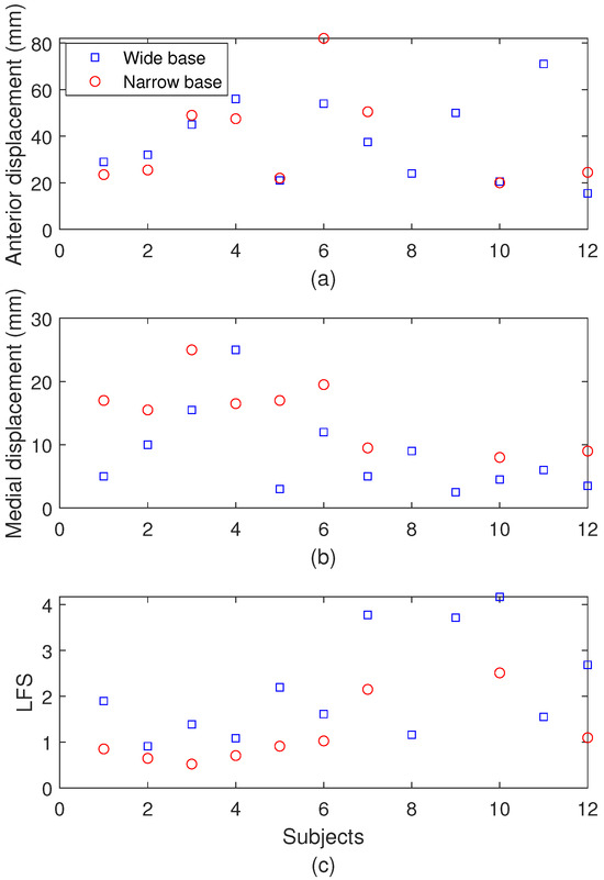 The biomechanical results of the balance protocol for each subject are presented in Figure 13, where the anterior displacement, the medial displacement, and the LFS are shown in Figure 13a–c, respectively. For the test with a wider base position, the results indicate the highest anterior displacement, medial displacement, and LFS for subjects 11, 4, and 10, respectively. It is also important to mention that the mean displacements with a wider base are smaller than the ones with a narrower base, which is expected since it is a condition with less stability. Thus, as higher LFS indicates higher postural control, the wider base tests present higher LFS values. In this context, there is an increase of 1% and almost 90% in anterior displacement and medial displacement, whereas there is an almost two-fold decrease in LFS when the mean results are compared for all patients in balance tests with wider and narrower bases. Considering the narrower base balance tests, subjects 6, 3, and 10 present higher values of anterior displacement, medial displacement, and LFS, respectively. The comparison with the mean values of the other subjects indicates an increase of 2.5 times in medial displacement for subject 6, whereas the increase in anterior displacement of subject 4 is around 10%. Similarly, the LFS increase in subject 10 is around 2.5 times greater when compared with the mean values of the other subjects.