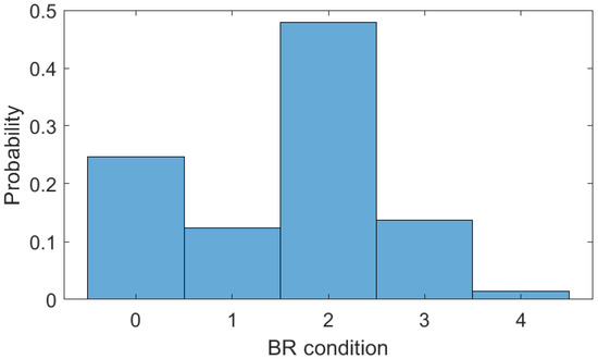 Then, for the TUG tests, the clustering of the breathing rates is employed, where the clustering conditions are analyzed, i.e., condition 0 (breathing rates below 10 BPM), condition 1 (between 11 BPM and 13 BPM), condition 2 (between 14 BPM and 16 BPM), condition 3 (between 17 BPM and 19 BPM), and condition 5 (above 19 BPM). Figure 14 shows the distribution of the different breathing rate conditions for each type of test, where it is possible to verify condition 2 (i.e., normal breathing condition) as the most common one. However, for the TUG with the motor task, the conditions of abnormal respiration are around 15%, which is related to the increase in difficulty of the TUG test when a dual task is incorporated.