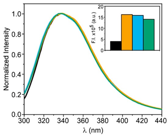 Normalized fluorescence emission spectra recorded at room temperature (λex = 290 nm) of PPL in solution (black), ChCl-Gly (blue), TMAC-Gly (green) and ChCl-urea (orange). Inset: Bar chart depicting the maximum fluorescence intensity of each spectrum prior to normalization.