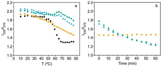 The intrinsic fluorescence of PPL was also used to examine conformational alterations of the enzyme upon thermal unfolding. In the native folded state, most of the tryptophan residues are found within the protein core, whereas in a partially folded or unfolded state, they are exposed to the solvent resulting in a red shift in the emission spectra. For this reason, monitoring the fluorescence spectra with temperature and plotting the ratio of intensities at 335 and 375 nm (I335/I375) is a good strategy to explore the thermal stability of PPL, in order to determine whether its incorporation into the DES can affect this stability. This study was first carried out in buffer, between 10 and 86 °C, at different scanning speeds (2.5, 5 and 10 °C/min). The obtained curves, displayed in Figure S1b, were very similar for the three selected rates and the results suggest that the protein is very sensitive against temperature, as was previously reported using circular dichroism [36]. As can be seen in Figure S1b, the I335/I375 ratio was practically constant up to 45 °C. Between 45 and 50 °C it diminished very slightly and above this temperature it decreased abruptly, with a midpoint temperature (Tm) of 58 ± 2 °C, which suggests that the protein unfolds through a two-state process, as has been reported for other hydrolases and for the PPL against chemical denaturants [11,36]. When the sample was cooled from 86 °C to room temperature, the value of the I335/I375 ratio was not recovered, indicating that the protein was unable to refold to its native conformation after cooling, in agreement with the results obtained by circular dichroism [36].