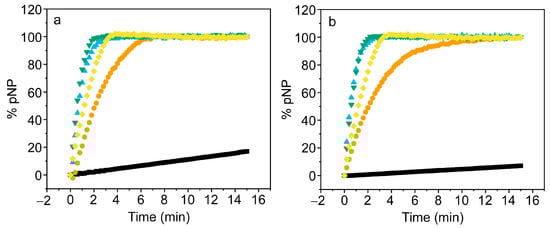 PPL activity assays were performed in triplicate using colorimetry to monitor the time-course production of p-nitrophenol (pNP), obtained by the PPL-catalyzed hydrolysis of either pNPAc or pNPP substrates. Measurements were conducted at both room temperature and at 37 °C using a UV-2700 spectrophotometer (Shimadzu, Tokyo, Japan). Enzyme solutions in buffer, in pure DES or in mixtures of DES and buffer, at a concentration of 175 μM and 2 mL as final volume, were placed in quartz cuvettes with a 10 mm path length, and absorbance values were recorded over time at 405 nm, where pNP exhibits a strong absorption peak. The kinetics of the catalyzed reaction was monitored plotting the % of pNP formed (obtained using molar extinction coefficient, ε405 = 1.8 × 104 M−1⋅cm−1) versus time [28].