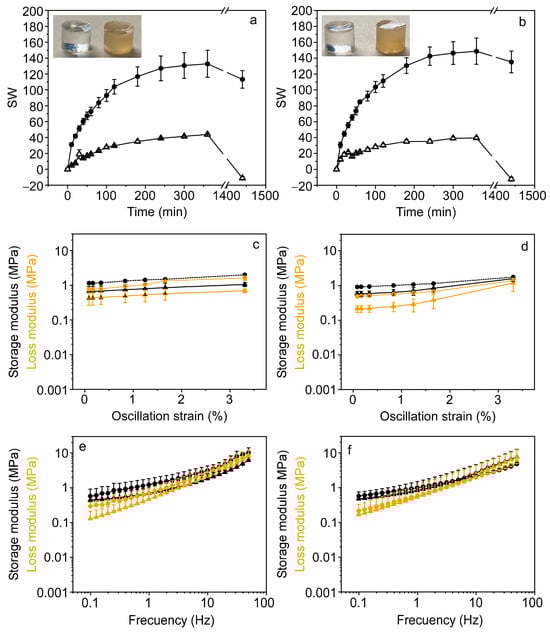Swelling behavior and rheological properties of ChCl-Gly@EG (a,c,e) and TMAC-Gly@EG (b,d,f) in the absence (triangle) and in the presence (circle) of PPL. Insets: Digital image of ChCl-Gly@EG (a) and TMAC-Gly@EG (b) without (left) and with (right) PPL obtained before swelling. Representative plots of strain (c,d) and frequency (e,f) sweep measurements at 25 °C for EG (triangle) and PPL@EG (circle). Error bars represent the standard deviation of two replicates.