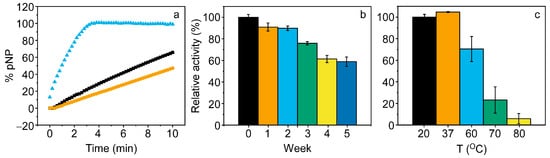 PPL activity expressed as percentage of pNP formation after addition of pNPAc (30 μM), measured in buffer (blue), TMAC_PL@EG (black) and ChCl_PL@EG (orange) (a). Effect of storage time on the relative activity of TMAC_PL@EG (b). Thermal stability of TMAC_PPL@EG evaluated by measuring residual activity after 5 min incubation at various temperatures (c). Error bars represent the standard deviation of three replicates.