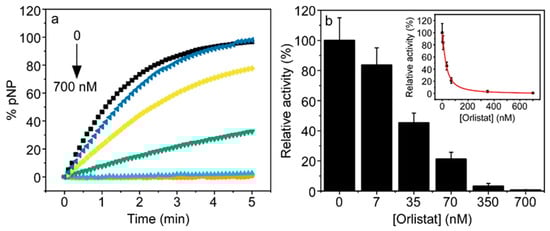 Effect of increasing concentrations of orlistat: 0 (black), 7 (navy), 35 (yellow), 70 (green) 350 (blue) and 700 (orange) nM, on the activity of TMAC_PPL@EG expressed as percentage of pNP formation after addition of pNPP (60 μM) (a). Relative activities of TMAC_PPL@EG derived from the linear slopes of the activity curves (b) and inset. Error bars represent the standard deviation of three replicates.