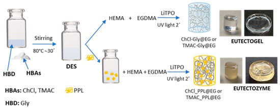 In this work, eutectogels were successfully synthesized via UV-induced radical polymerization of 2-hydroxyethyl methacrylate (HEMA) and ethylene glycol dimethacrylate (EGDMA) in DES composed of either TMAC-Gly or ChCl-Gly. Porcine pancreatic lipase (PPL) was immobilized within these matrices, representing one of the first reported cases of enzyme incorporation in such materials. Prior to immobilization, PPL was characterized in both DES, where it was found that DES thermally stabilize PPL and maintain its conformational integrity, despite limited catalytic activity in the neat solvent. Enzymatic activity was efficiently restored, and even improved, upon dilution with buffer to DES concentrations of 25–50% (v/v), supporting the use of DES as effective preservation media when adequate hydration is ensured. The eutectogels displayed elastic solid behavior, with the incorporation of PPL slightly increasing internal friction without altering the overall viscoelastic response. The swelling of the material in water was significantly enhanced in enzyme-loaded eutectogels, likely due to favorable interactions between water and hydrophilic regions on the protein surface.