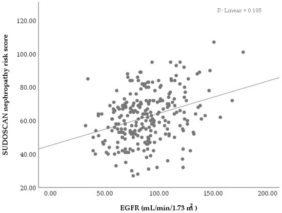 The increase in SUDOSCAN nephropathy risk score led to better kidney function, indicated by EGFR, as suggested by the positive but weak correlation obtained (Table 3, Figure 1). While the association between EGFR and SUDOSCAN nephropathy risk score exists in our study, it is modest and does not support a strong predictive relationship. Our findings are in agreement with previous reports [6,9] and suggest the possibility of using the SUDOSCAN nephropathy risk score as a supporting tool in kidney function evaluation under limited conditions (other clinical metabolic characteristics should be considered).