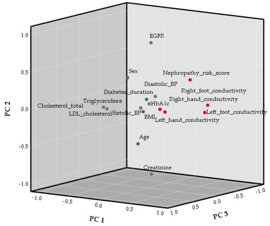 The contribution of the variables to each principal component is presented in Table S1 in the Supplementary Materials. PC1 was associated with SUDOSCAN right and left foot conductivity and nephropathy risk score (Figure 2). PC2 was associated with creatinine and EGFR values, while PC3 was associated with total and LDL cholesterol levels. SUDOSCAN left and right hands’ conductivity were associated with PC4 (Table S1, Supplementary Materials). PC5 was associated with diabetes duration, BMI, triglycerides, and age. The systolic and diastolic BP gave PC6, while the last PC (PC7) was associated with glycosylated hemoglobin. Thus, PC1 and PC4 refer to SUDOSCAN parameters, PC2 indicates kidney function, PC3 is related to metabolism, PC5 refers to the clinical and demographical profile of the patients, PC6 indicates cardiovascular system functioning, and PC7 is related to glucose metabolism.