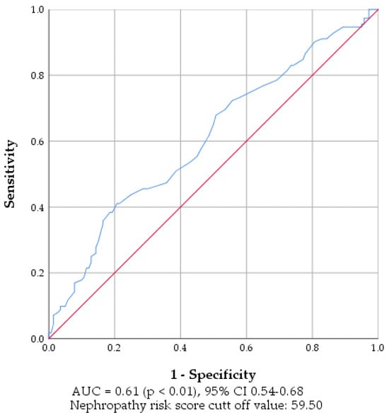 The area under the curve (AUC) of the receiver operating characteristic (ROC) analysis (Figure 3) revealed a modest possibility of SUDOSCAN nephropathy risk score to predict CKD since it was 0.61 (p < 0.01, 95% CI 0.54–0.68), an acceptable value. The cut-off value was 59.50, considering the highest sensitivity and specificity (65.2 and 50%, respectively). Thus, the SUDOSCAN nephropathy risk score has limited standalone value for CKD prediction, as its moderate sensitivity may support early screening, but its low specificity requires additional medical investigations. Mao et al. [6] demonstrated the effectiveness of SUDOSCAN for CKD screening in Chinese patients and found that the cut-off value for the SUDOSCAN diabetic nephropathy score is 59.50. Nica et al. reported an AUC value of 0.63 (95% CI 0.563–0.696) for the SUDOSCAN Nephro-score ROC curve in patients with type 2 diabetes.