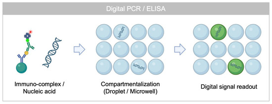 Due to the increasing importance of ultra-sensitive biosensing technologies for diseases prognosis and diagnosis in infectious diseases, cancers, and neurodegenerative diseases, numerous ultra-sensitive biosensing tools have been developed, including fluorescence, nanoplasmonic, and electrochemical sensing [1,2,3,4]. Single molecule counting assay based on digital signal readout strategy has been emerged for ultra-sensitive detection of various biomarkers [5,6]. Notably, digital ELISA represented by single molecule array technology (SiMOA) technology commercialized by Quanterix has been widely adopted due to its automated system and robustness [7,8]. SiMOA technology has been applied to detect clinically relevant biomarkers including phosphorylated tau 217 (p-Tau 217) [9], inflammatory markers [10], and extracellular vesicles’ surface protein [11]. Digital ELISA utilizes enzyme-based signal amplification, which requires compartmentalization of immunocomplexes by water–oil interfaces to localize amplified fluorescence signals [12,13].