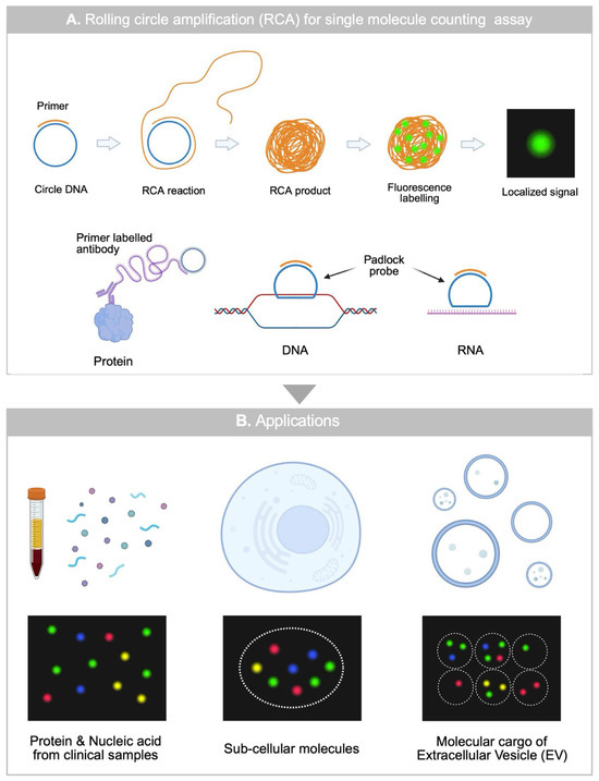 An overview of RCA-based single molecule counting assay (A) Working principle of RCA-based single-molecule counting assay for protein, DNA, RNA. (B) Applications of RCA-based single molecule counting assay for analyzing clinical samples, single cells, and single EVs.