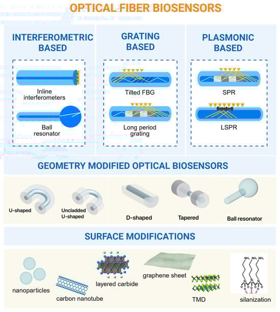 Interferometric, grating-based, and plasmonic methods are the main sensing methods that make optical fiber biosensors work. Interferometers are great at identifying changes in the refractive index, gratings are great at finding specific biomarkers on small, multiplexed platforms, and plasmonic setups enable analysis of data in real time without using labels and with very quick response times [51]. These approaches are not mutually exclusive; hybrid designs that integrate, for instance, grating structures with plasmonic coatings or interferometric platforms with tapered microfibers have shown synergistic improvements in detection performance [52,53,54]. As fabrication technologies improve and new materials like two-dimensional films and nanostructured coatings become easier to obtain, sensing approaches are likely to move toward highly integrated, small, and clinically useful platforms for finding cancer early. The summarized figure of the types of optical fiber is presented in Figure 1.