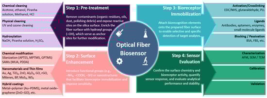 Surface functionalization is an important step in developing optical fiber biosensors, as it directly influences sensing performances such as sensitivity, repeatability, stability, and specificity. The choice of functionalization technique depends on various factors, including the type of optical fiber sensor, the target analyte, and the intended biomedical application. Several commonly used surface functionalization strategies have been developed for the detection of cancer biomarkers. These include silanization, layer-by-layer assembly, nanomaterial coatings, polymer-based modifications, etc. Layer-by-layer technique involves consecutive deposition of functional coatings (polymers, nanomaterials, etc.) on the surface of optical fibers with the ability to closely control the thickness and composition of layers [55]. These techniques demonstrated efficient immobilization of biorecognition elements such as antibodies, aptamers, or peptides onto the surface of optical fibers enabling the detection of cancer proteins and cells with different specificity and low limits of detection. During each step of the fabrication process, the optical fibers are calibrated by evaluating their performance in media with varying RI to verify the success of each functionalization step. The sensor surface can also be characterized by utilizing techniques such as atomic force microscopy (AFM), scanning electron microscopy (SEM), transmission electron microscopy (TEM), fluorescence microscopy, and other techniques [56,57]. The validation of the fabricated sensors is performed by the detection of target analytes in different biological media and comparison of the results with the control samples. Figure 2 below outlines the main steps in developing an optical fiber biosensor, which include pre-treatment, surface enhancement, bioreceptor immobilization, and sensor evaluation.