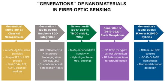 Their integration onto the fiber surface can be achieved through several approaches, including physical deposition techniques such as sputtering or evaporation to generate thin metallic coatings, chemical deposition methods such as layer-by-layer assembly or chemical vapor deposition (CVD) for uniform coverage, and self-assembly strategies that exploit electrostatic interactions or covalent bonding to immobilize nanoparticles [76]. These strategies enable precise tailoring of sensor interfaces, thereby significantly improving sensitivity, selectivity, and stability in cancer detection applications [82,83]. The progressive refinement of these integration strategies has paralleled the broader evolution of nanomaterials used in fiber-optic biosensing, as illustrated in Figure 5.