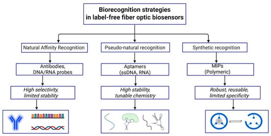 Wei et al. [115] employed an optical microfiber coupler (OMC) immunosensor to quantitatively detect the carcinoembryonic antigen (CEA) in human serum. Surface functionalization was based on LbL electrostatic assembly of poly(diallyldimethylammonium chloride) (PDDA) and poly(acrylic acid) (PAA). Alternating positively charged PDDA and negatively charged PAA layers generated a stable charged interface, while PAA provided carboxyl groups that were subsequently activated with NHS/EDC to enable covalent immobilization of anti-CEA antibodies. Then, residual sites were blocked using ethanolamine and preadsorbed serum to reduce nonspecific adsorption. This biosensor demonstrated ultrahigh sensitivity based on the interference turning-point effect, achieving a detection limit as low as 34.6 fg/mL (0.475 fM) with a wide dynamic range. On the other hand, for the detection of CEA, Li et al. [116] modified the surface of TFBG optical fiber using an electrospun polyacrylonitrile (PAN) nanofiber membrane and gold nanomembrane. The PAN nanofiber layer provided larger surface area and porosity, resulting in immobilization of more anti-CEA antibodies. Additionally, the PAN layer acted as a biocompatible bridge between the inorganic fiber surface and the organic biorecognition elements. The PAN-based biosensor demonstrated a sensitivity of 0.46 dB/(µg/mL) and a low limit of detection of 505.4 ng/mL in buffer.