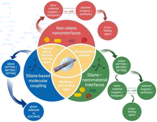Murugan et al. [71] discusses two silanization methods: wet-chemical and vapor-phase processes, utilizing silanes such as 3-aminopropyl triethoxysilane (APTES) and 3-glycidyloxypropyl trimethoxysilane (GPTMS) for surface modification of oxide interfaces in biosensor applications.