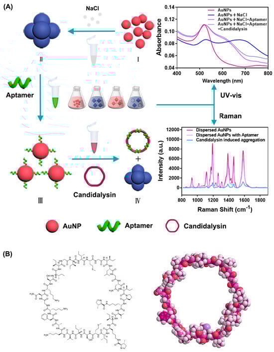 The mechanism of the Aptamer–AuNPs-based colorimetric biosensor is predicated on the aggregation and dispersion of AuNPs under certain conditions. In a colloidal solution, negatively charged AuNPs exist in a dispersed state. Upon addition of NaCl, citrate-stabilized AuNPs aggregated (blue). Aptamers can adsorb onto AuNPs and stabilize their dispersion, maintaining the red color [18,29]. When Candidalysin was introduced, it bound the aptamer and displaced it from the AuNPs surface, re-enabling aggregation (blue); the shift in UV–vis spectra and the SERS response were then used for quantification, forming different |A520′ − A520|/A520 ratios at varying Candidalysin concentrations (A520 and A520′ demonstrate absorbance at 520 nm before and after addition of Candidalysin, respectively) [30,31]. This mechanism enables the quantitative determination of Candidalysin.