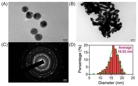 A high-resolution transmission electron microscope (JEM-2100F, JEOL Ltd., Tokyo, Japan) was used to illustrate the morphology and characterization of AuNPs. Simultaneously, the particle size of AuNPs was determined using the Image J software (version 1.53t) particle analyzer tool. All experiments were performed using AuNPs synthesized in the same batch to ensure valid internal comparisons.