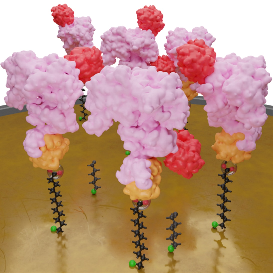 Figure 1b), self-assembled monolayers (SAMs) on gold surfaces enable strong covalent coupling and oriented attachment of immobilized molecules, offering excellent control over enzyme density and activity [
