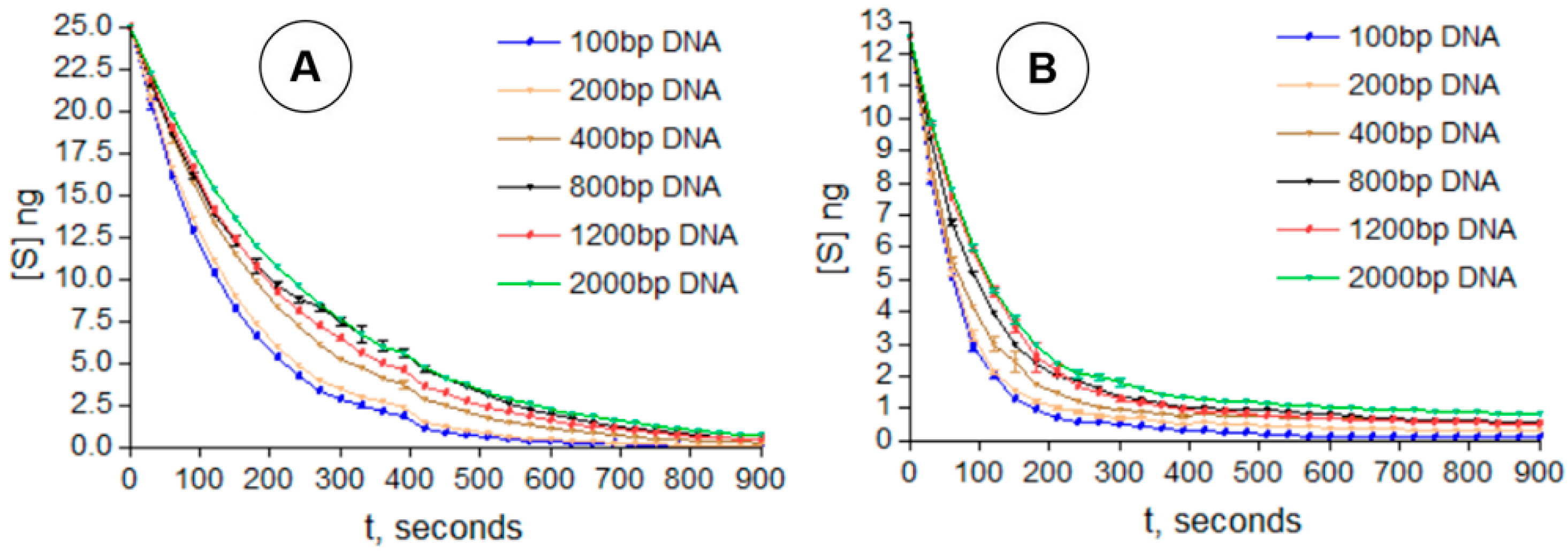 2+ ions facilitate the reaction. One ion activates a water molecule for nucleophilic attack, while the other stabilizes the leaving phosphate’s negative charge. This hydrolysis releases a deoxynucleotide monophosphate (dNMP). The hydrolysis of different DNA length fragments during the enzymatic reaction was monitored by measuring absorbance at 260 nm at regular intervals (every 30 s for 1 h). These absorbance values were converted into the remaining DNA concentration at each time point (