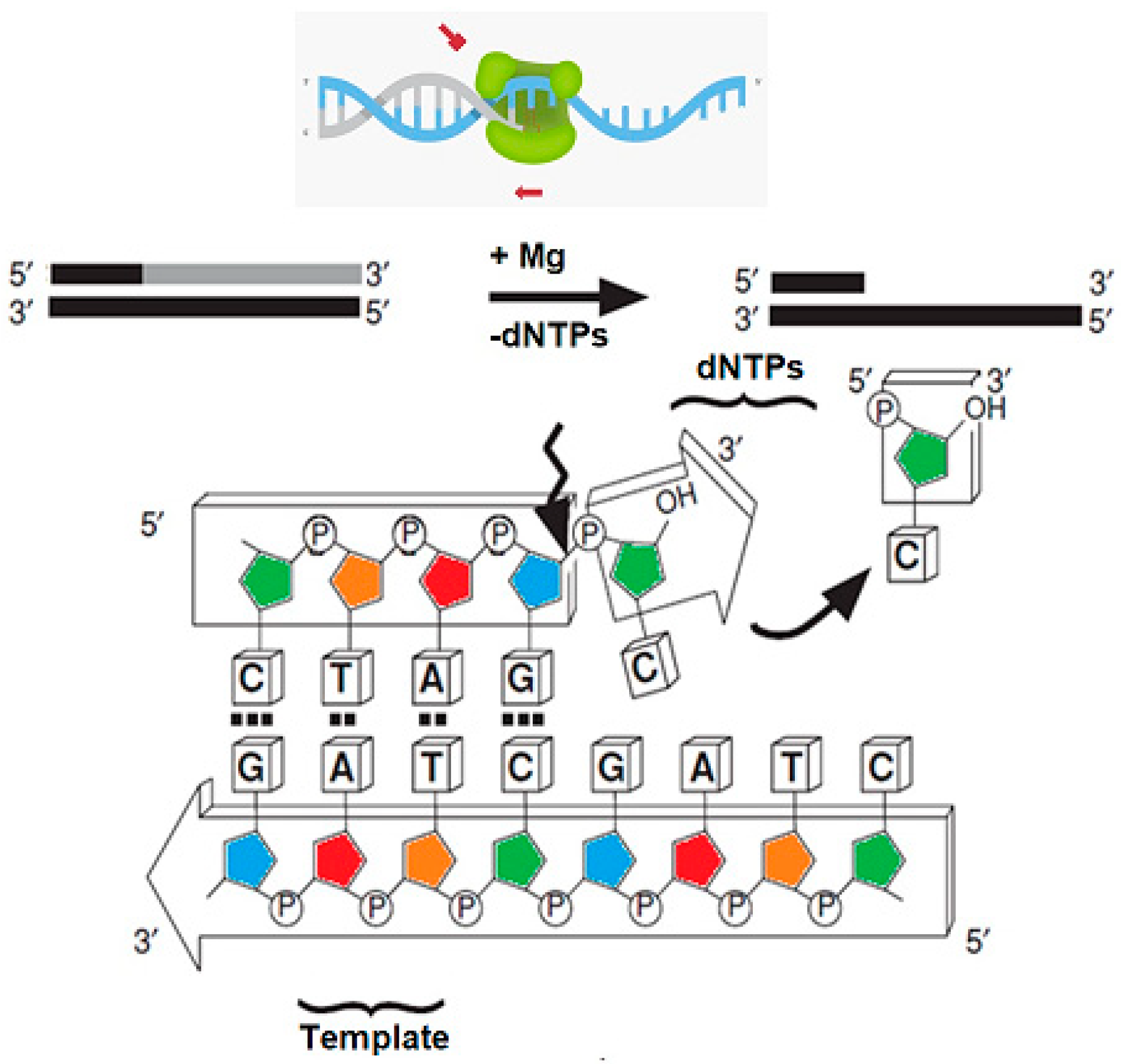 24]. Blunt-ended DNA fragments are generally more structurally stable but may exhibit lower efficiency in specific enzymatic reactions, such as ligation. T7 DNA polymerase binds to these blunt-ended DNA fragments, which serve as suitable substrates for its 3′→5′ exonuclease activity. This enzymatic function progressively removes nucleotides from the 3′ terminus of the DNA strand [
