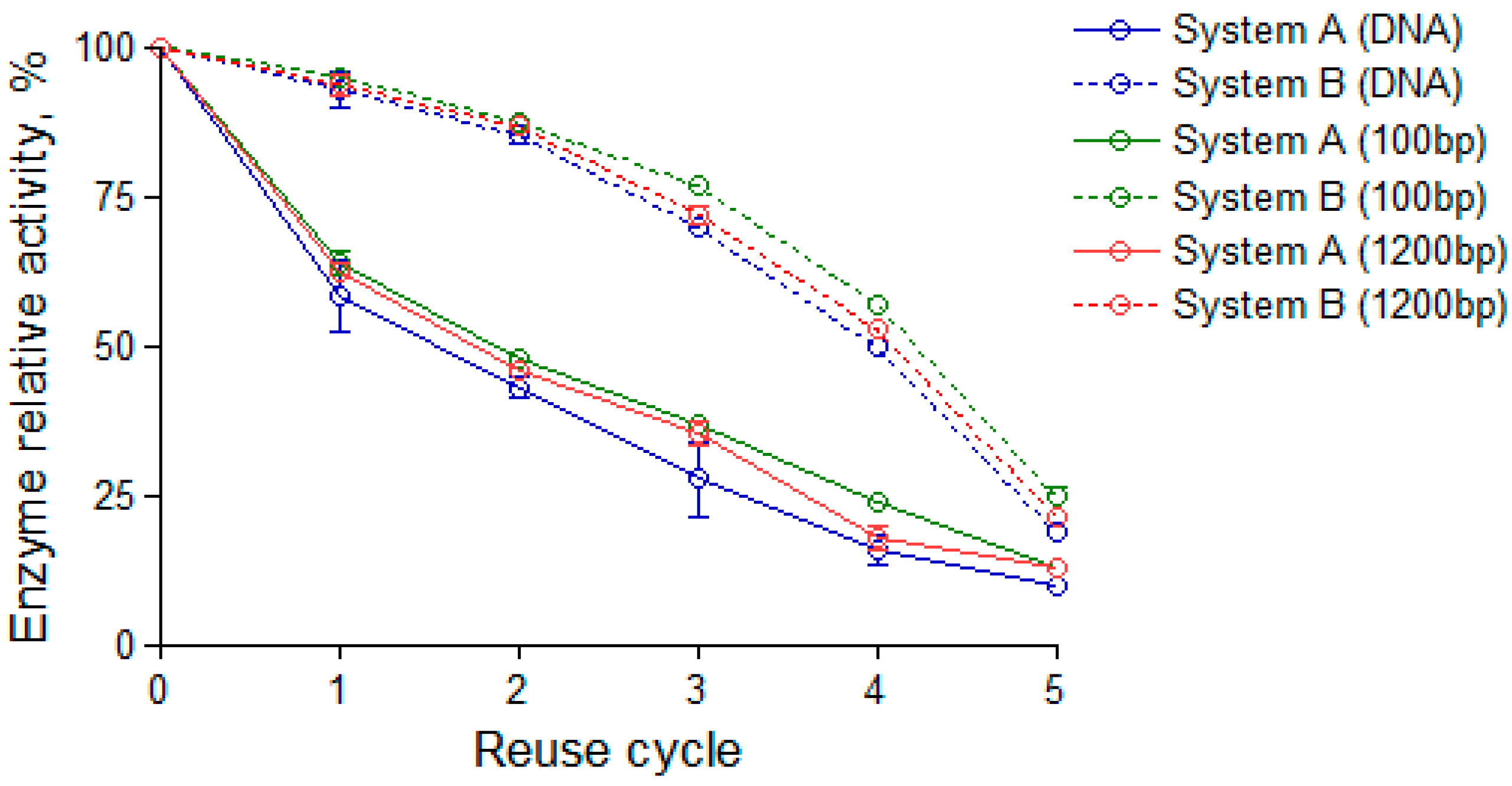 Error bars represent the standard deviation from three independent replicates, confirming the high reproducibility of the enzymatic response. By the third reuse cycle, the 90-min system retained ~50% of its initial activity (