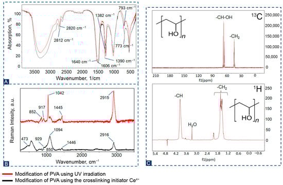 (A)—IR spectra of the obtained PVA; (B)—Raman spectra of the obtained PVA; (C)—1H and 13C NMR of the PVA hydrogel.