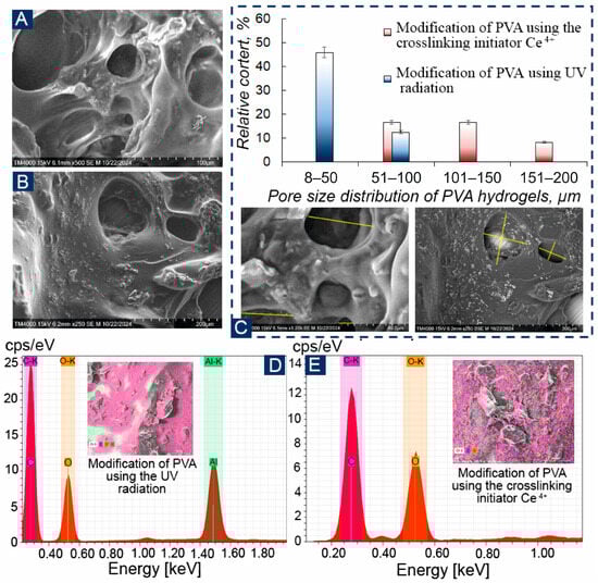 SEM hydrogel PVA: (A)—modification of PVA by UV irradiation; (B)—Modification of PVA using a crosslinking initiator Ce4+; (C)—pore size distribution of PVA hydrogels obtained by two methods; (D,E)—EDX for the obtained hydrogels.