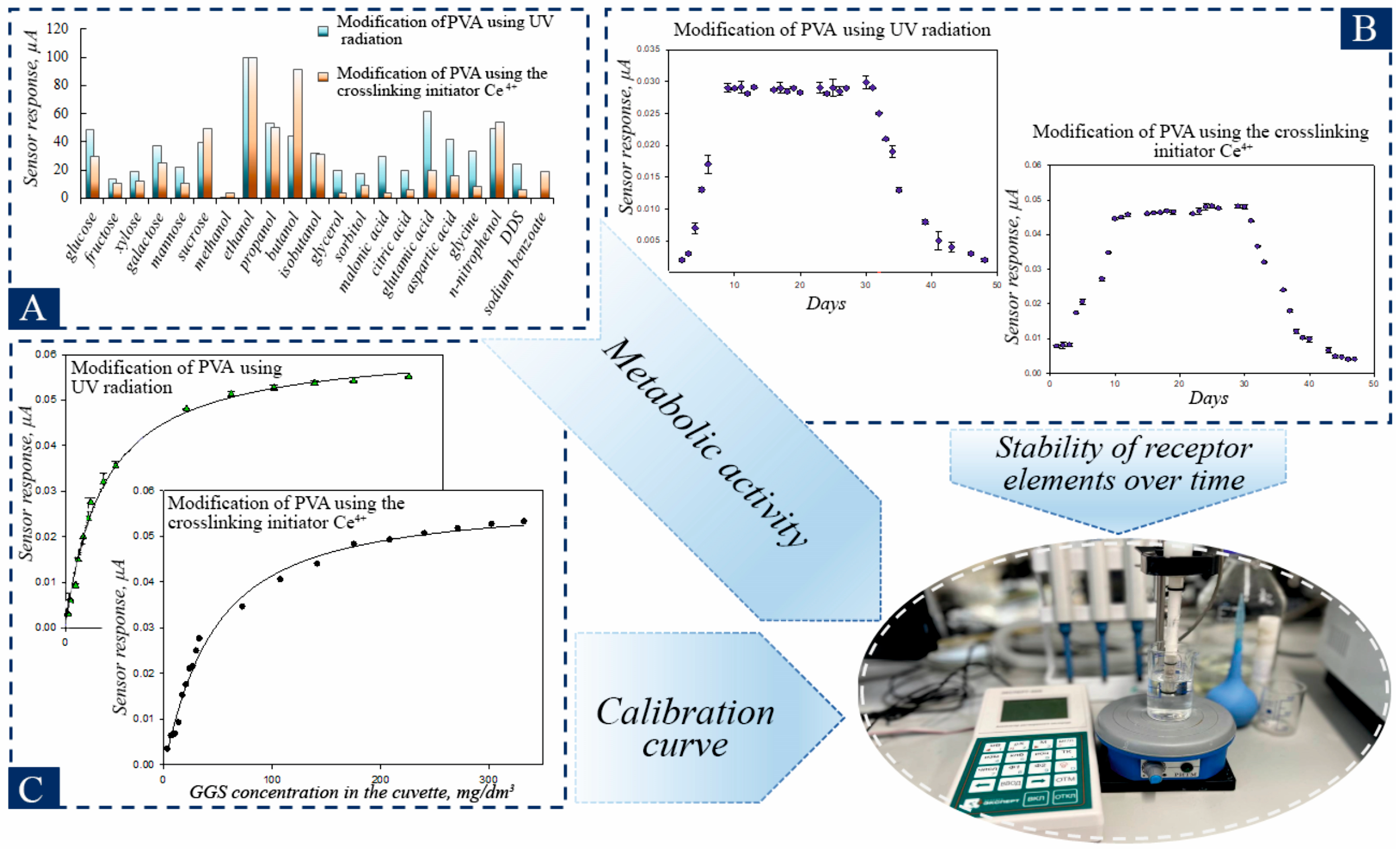 | Parameters of the Receptor Element | PVA-UV | PVA-Ce4+ | PVA+N-VP [42] |