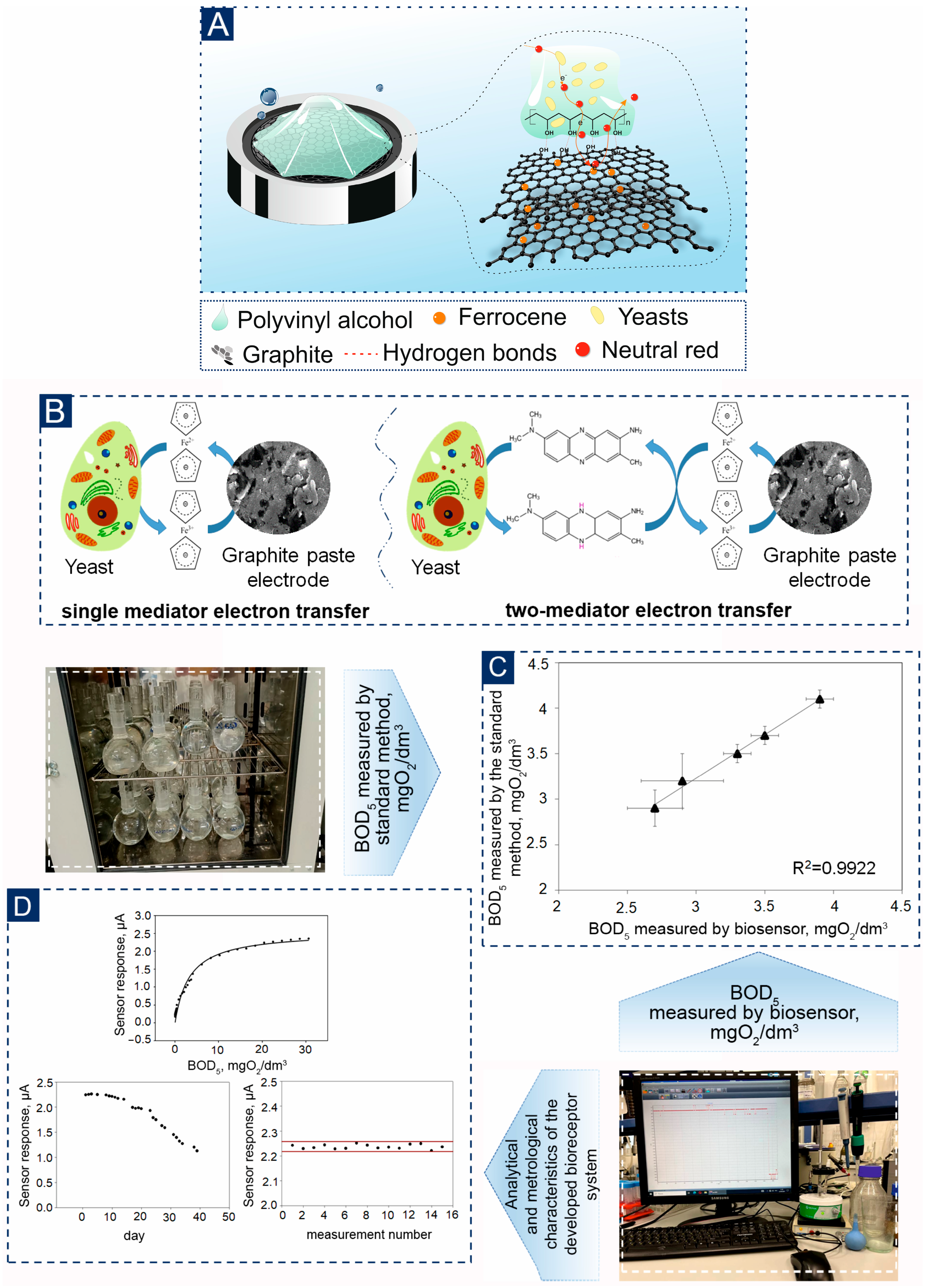 - Zaitseva, A.S.; Arlyapov, V.A.; Yudina, N.Y.; Alferov, S.V.; Reshetilov, A.N. Use of One- and Two-Mediator Systems for Developing a BOD Biosensor Based on the Yeast Debaryomyces Hansenii. Enzyme Microb. Technol. 2017, 98, 43–51. [Google Scholar] [CrossRef]