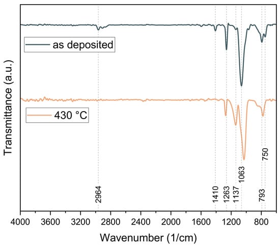 After thermal annealing at 430 °C, the C-H-associated bands in the FTIR spectrum nearly vanish, indicating a change in the polymer’s structure. This is further supported by the shift in the siloxane ring-associated band to a lower wavenumber (1030 cm−1), as well as by the appearance of a pronounced band at 1137 cm−1.