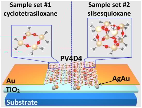 Samples representation in cross-section of TiO2 structures coated with PV4D4 before (cyclotetrasiloxane) and after (silsesquioxane) heat treatment.