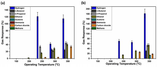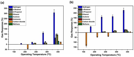 On the other hand, Figure 7b shows an even better selectivity for both hydrogen and carbon dioxide. Thermally annealing the polymer-coated sample provided a trade-off between decreased sensitivity and increased selectivity. Thus, although the highest response to hydrogen gas is measured at 350 °C, the value has slightly decreased to 230%. At other operating temperatures, however, the response to hydrogen gas increased compared to the untreated sample. Specifically, responses of 175% at 300 °C, 160% at 250 °C, and 60% at 150 °C were recorded.